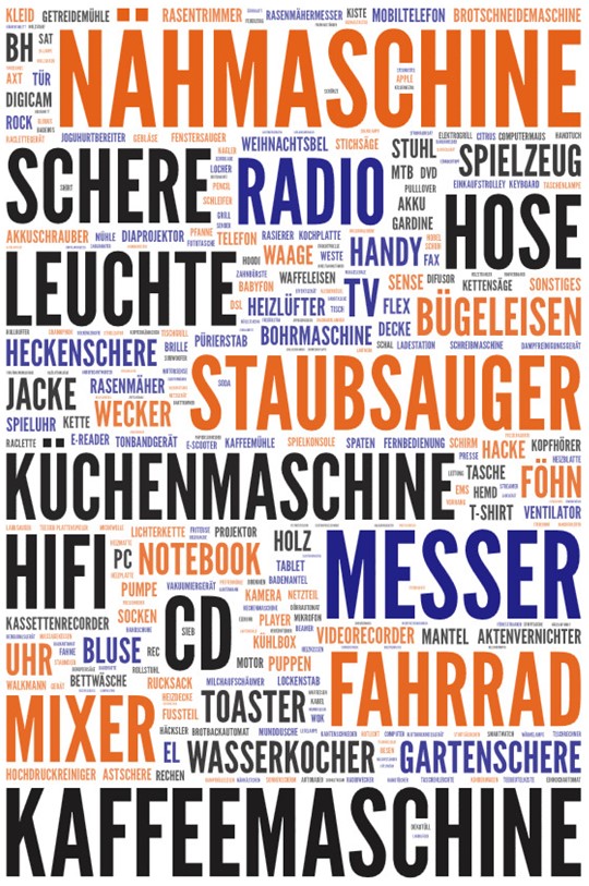 elektrische Geräte, Möbel, Spielzeug, Fahrräder, alles aus Holz, Kleider und Textilien, Haushaltswaren und Elektronik.